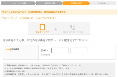 ファンくるでは、飲食グルメモニターを利用するためには、最初の1回だけ「電話番号認証」が必要になります。